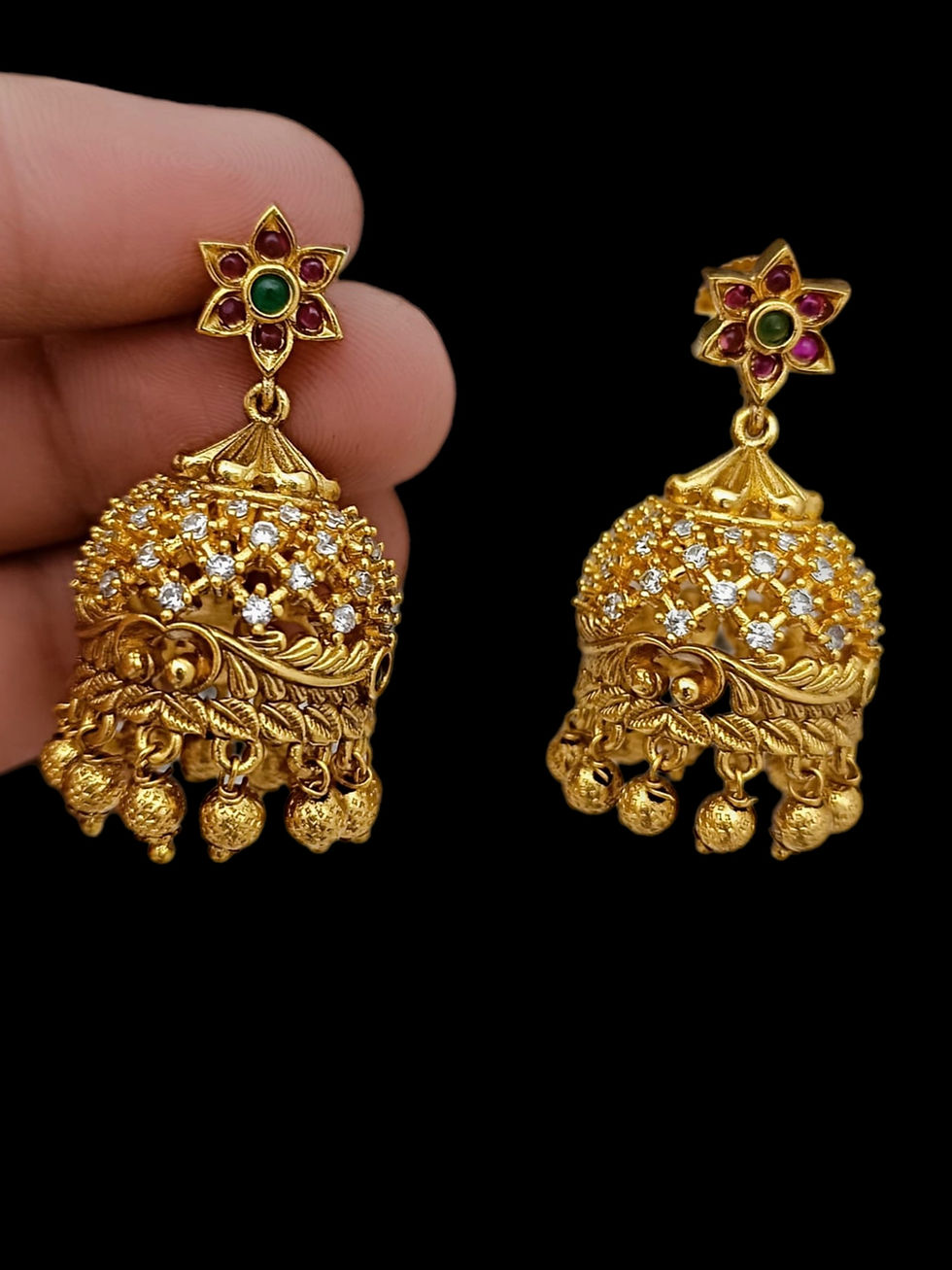 Pretty Big CZ Stones Matt Finish Jhumka Earring in Pink-Green
