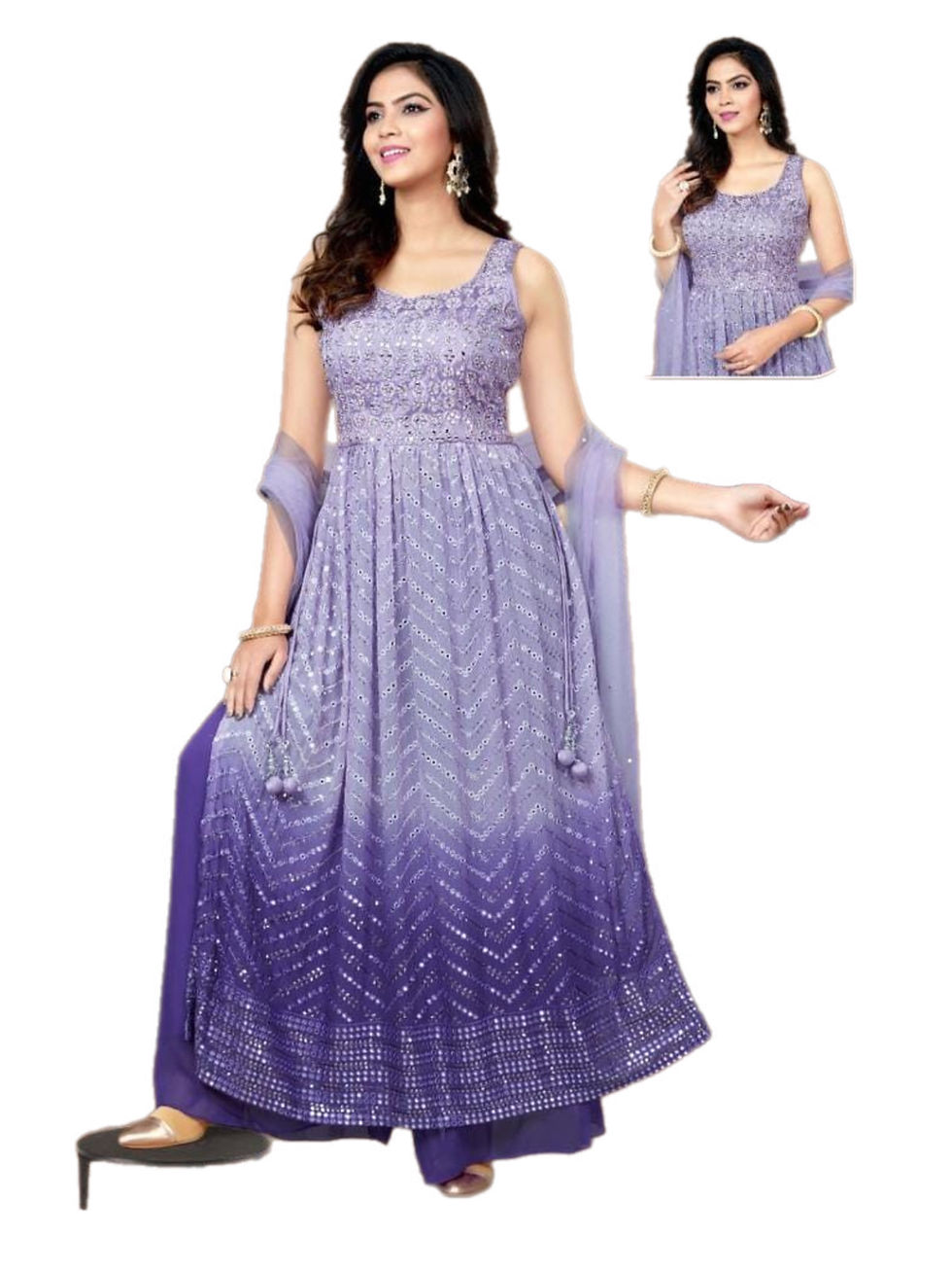 Plus Size Georgette Embroidered Plazzo Suit Set in Purple